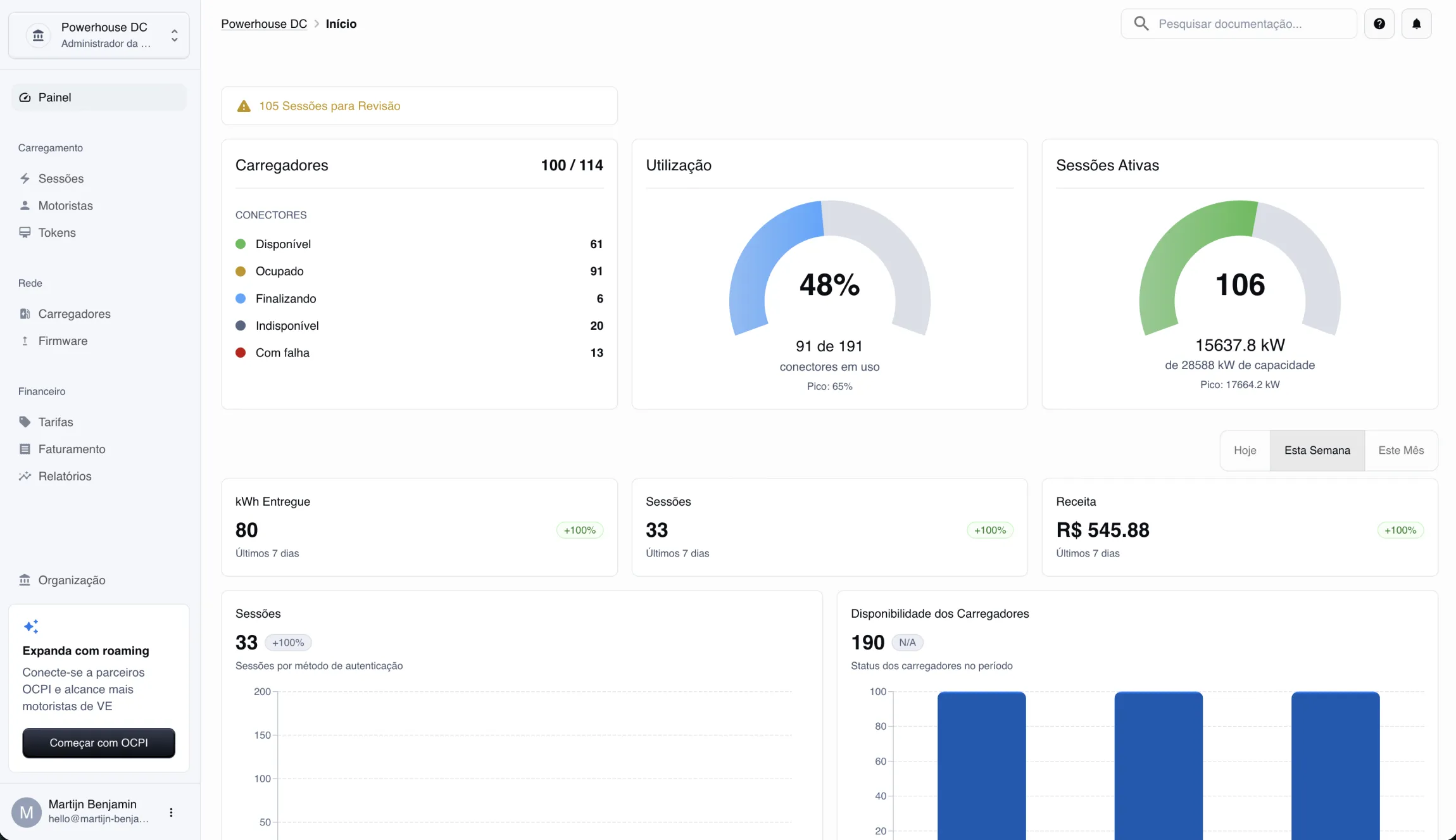 Veja como sua rede está performando em um relance. Acompanhe energia entregue, sessões, receita, status dos carregadores e utilização — tudo atualizado em tempo real.