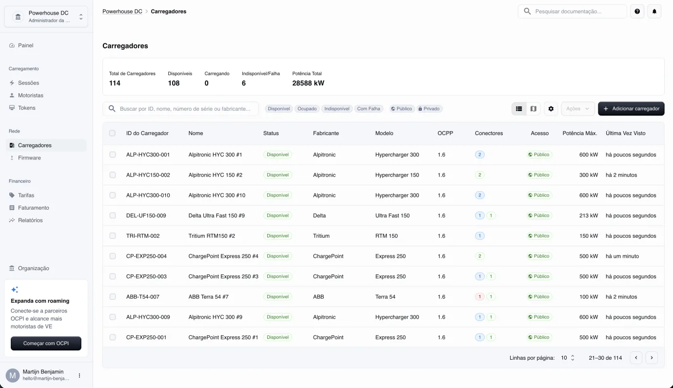 Monitore carregadores em tempo real, acompanhe sessões e receita, gerencie motoristas e tokens de acesso, configure tarifas e controle o faturamento — tudo em um único painel na nuvem. Tudo que você precisa para operar sua rede.